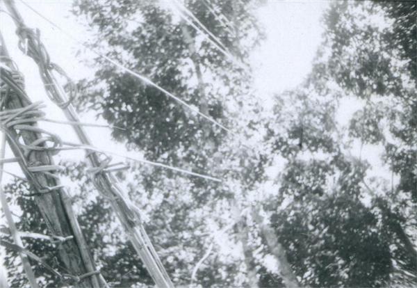 | Lianes-suspentes secondaires d'un pont de lianes et leurs attaches sur les suspentes principales |