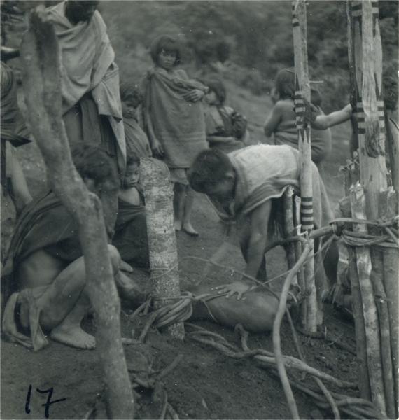 | Jeune homme sacrifiant un petit porc aux pattes liées couché par terre. Autour de lui, femmes, enfants, hommes dont un, accroupi, l'assiste |