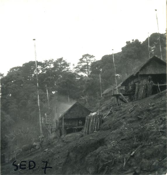 | Deux maisons sur pilotis au flanc d'une forte pente. Plusieurs poteaux de sacrifice à côté des maisons. A l'un d'entre eux est attaché un buffle |