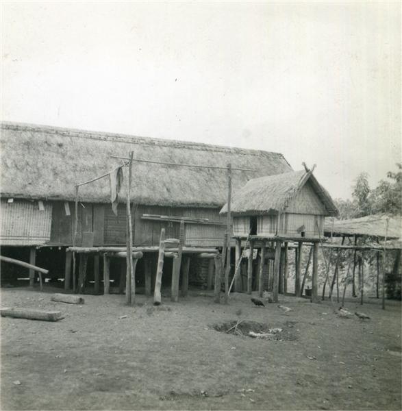 | Maison vue de côté, avec un grenier à riz sur le côté de la plateforme et deux perches d'étendage sur deux côtés de celle-ci |