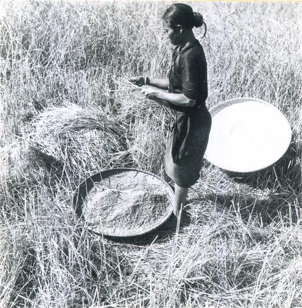 | Femme égrainant du paddy dans un van au milieu d'un champ. Deux autres vans, dont un rempli de tiges récoltées, à côté d'elle |