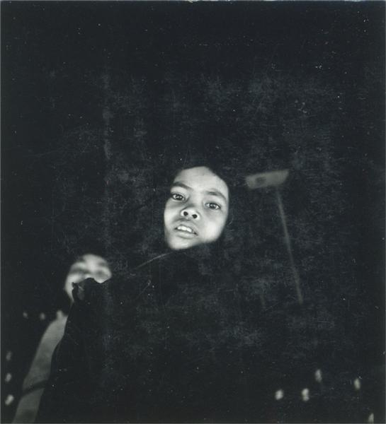 | Garçon enveloppé dans une couverture dont seule la tête dépasse. Un second garçon partiellement visible derrière lui |