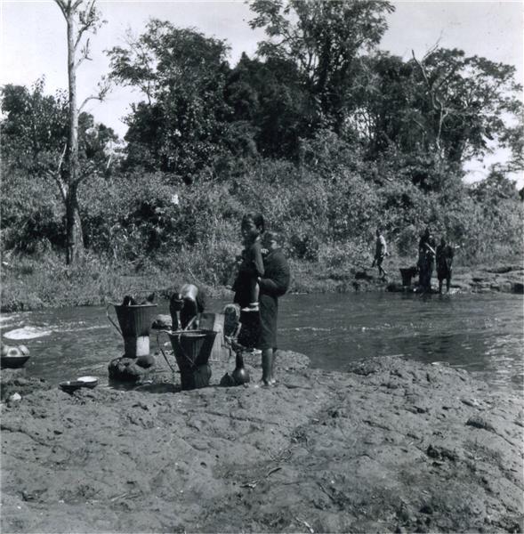 | Jeune femme, enfant dans le dos, sur la berge rocheuse d'une rivière. Un homme et trois femmes sur la rive opposée |