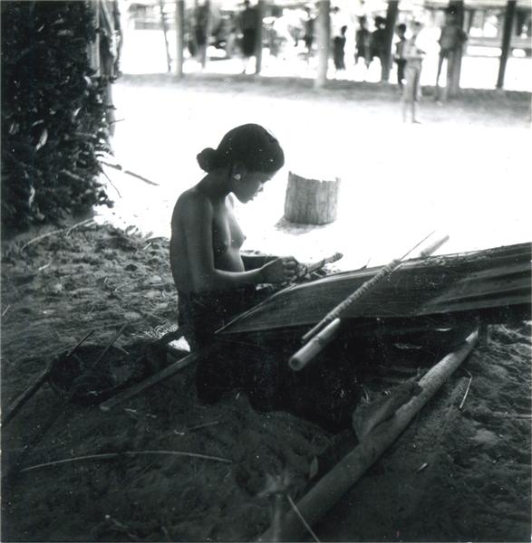 | Jeune femme tissant avec un métier à dossière sous une maison |