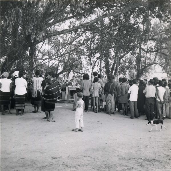 | Hommes, femmes et enfants assistant à une messe en plein air dite par un prêtre blanc, sous les arbres. Un jeune garçon blanc et un chien au premier plan |
