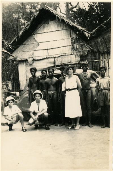 | Groupe de cinq jeunes hommes et de deux garçons habillés à l'occidentale debout au côté d'une femme blanche portant un chapeau et de deux garçons blancs accroupis. Le groupe pose devant une voiture |