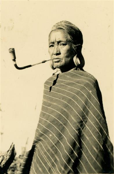 | Femme âgée vue de 3/4 face fumant une grande pipe au long tuyau. Elle est enveloppée dans une couverture à filets clairs |