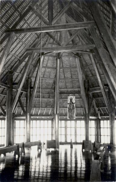 | Chœur d'une église d'un monastère bénédictin et sa charpente. Une peinture de la Vierge Marie est suspendue à mi-hauteur. Des bancs sont disposés des deux côtés |