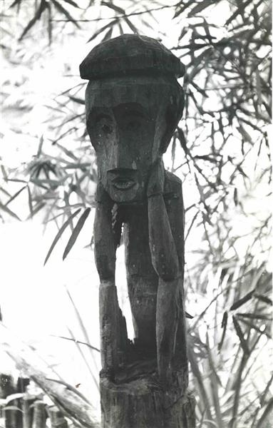| Poteau sculpté érodé d'une tombe représentant un homme assis coiffé d'un chapeau |