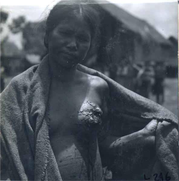 | Woman moving away a blanket from before her chest to show her deeply injured breast by the paw stroke of a tiger |
