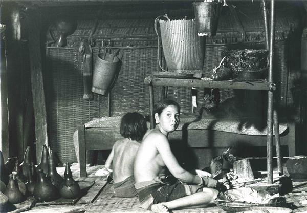 | A woman and her daughter preparing food inside a house. A bed next to the opposite wall, many gourds on the left side a few large jars |