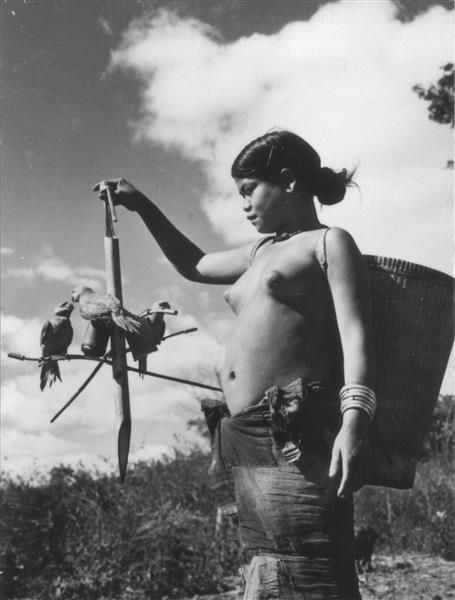 | Young woman, carrying a back basket, holding a perch with three parakeets |