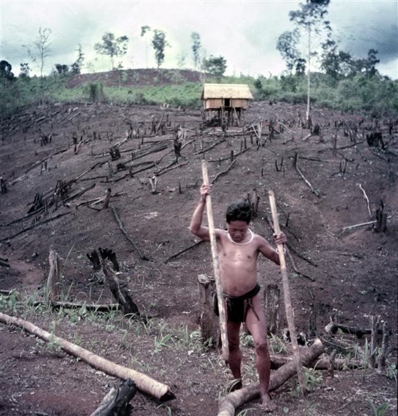 Homme en train de faire des trous pour les semis avec deux pieux (vue générale du ray avec sa cabane de champ)