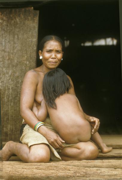 | Femme faisant face au photographe, un petit enfant contre elle sur la plateforme à l'entrée d'une maison |