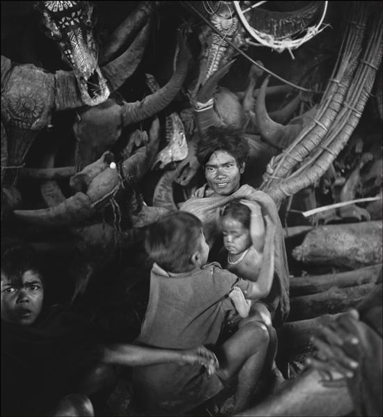 Homme et plusieurs enfants devant les bucranes conservés dans une maison commune d'un village