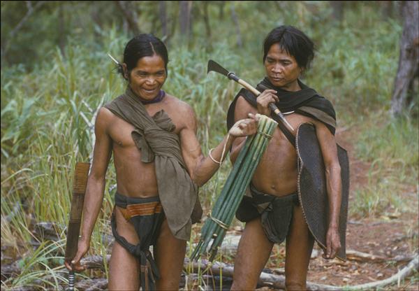 Deux hommes dans une forêt de pins, l'un tient un faisceau de tiges et une épée/coupe-coupe dans son étui, l'autre une hache et un panneau contre la pluie