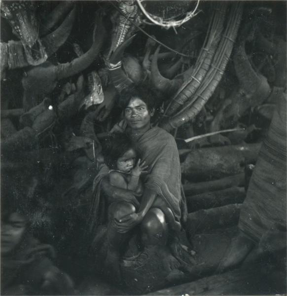 | Homme et une petite fille assise sur ses genoux devant les bucranes conservés dans une maison commune d'un village |