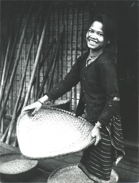 Jeune femme en train de vanner du riz sur la terrasse d'une maison