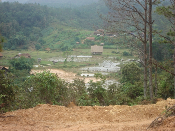 | Community house of a village amidst wet rice fields with several rice granaries and a few houses |