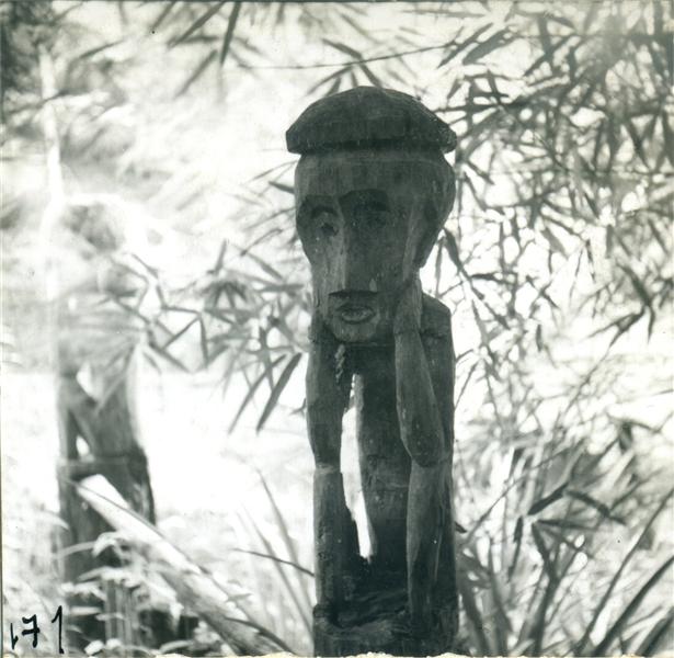 | Eroded sculpted pole of a tomb in the shape of a sitting man wearing a hat (alternate shot) |