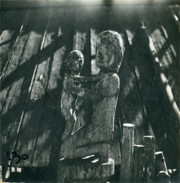 | Sculpture of a kneeling mother holding a child standing on her thighs. The roof of the tumb to which it belongs behind |