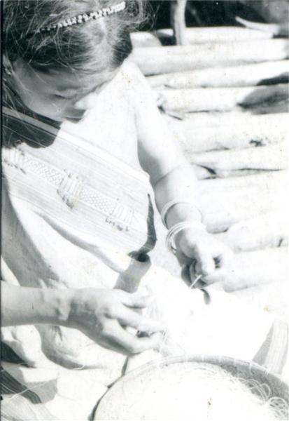 | Sitting young woman holding thread coming from a flat basket in her hands (overexposed printing) |