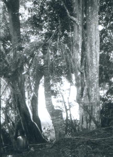| Trees anchoring the hanging creepers of a creeper bridge. A man sitting on the left |