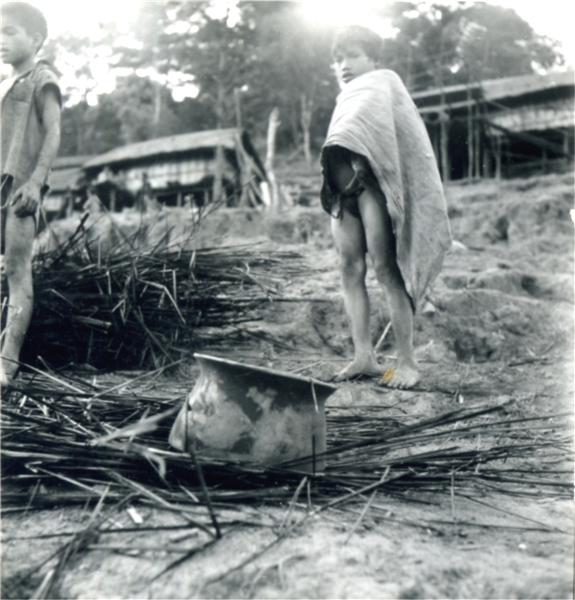| Two young boys near heaps of branches or light wood piled up to cook pottery. Houses of a village above them on the slope |
