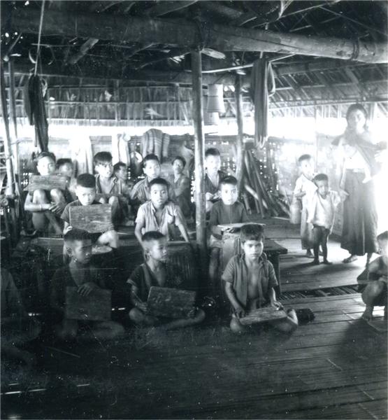 | Schoolboys sitting on three rows in a classroom. A woman and two young boys on the right and three young men in the back of the house |