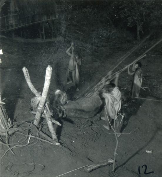 | Four men plunging their spears in the side of a water buffalo lying on the ground |