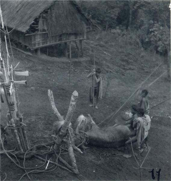 | Four men plunging their spears in the side of a water buffalo lying on the ground. Sacrifice pole on the left |