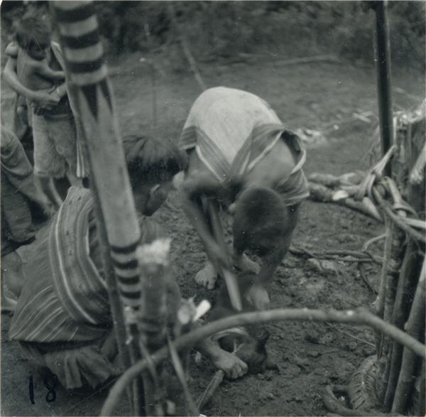 | Young man sacrificing a small animal (pig?) lying on the ground. A child in a man's arms watches and another man, squatting next to him, is holding the animal's muzzle |