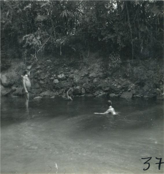 | Three young men in a river. Two are partly immersed in water |