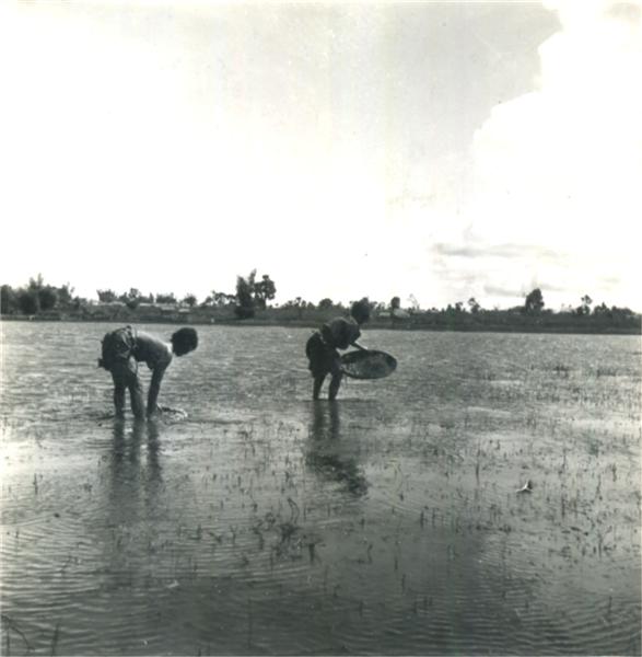 | Young woman and man fishing with a basket/fish-trap in a temporary pond on the road Ban-me Thuôt-Pleiku |