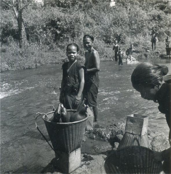 | Two young maiden on the rocks of a riverside. A topless woman standing feet in the water and children bathing on the opposite side |