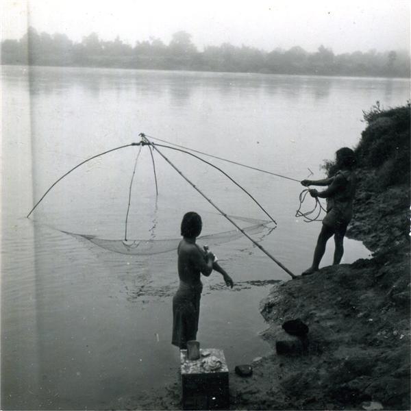 | Man standing on a river edge holding the rope of his square fishing net plunged in a river. A woman having a wash slightly before him |