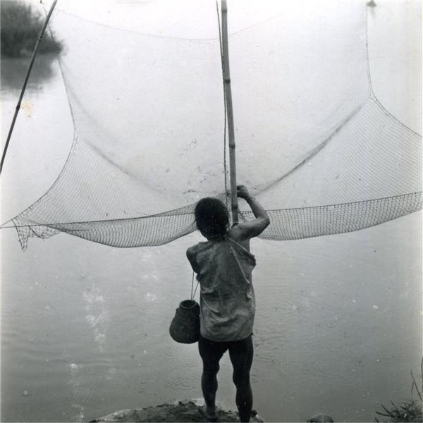 | Man, fishing basket hanging on his side, preparing his square fishing net to throw it in a river |