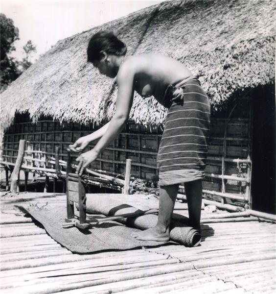 | Young woman standing on a half-unrolled mat, bending down towards a gin mill put on the platform of a house |