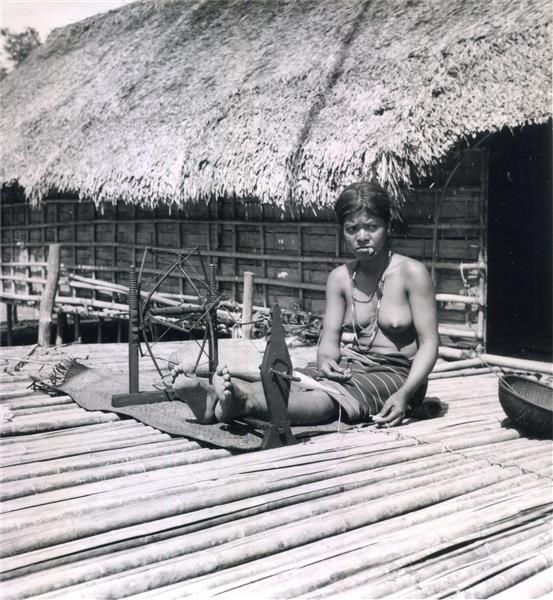| Young woman sitting on the platform of a house, in front of a spinning wheel. She looks towards her left with an unhappy face, a cigarette in her mouth |