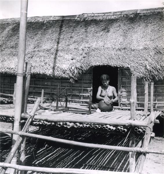 | Young woman sitting on the platform of a house, in front of a spinning wheel. She rolls up coton fiber around a stick, a cigarette in her mouth |