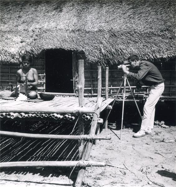 | Young woman sitting on the platform of a house, pushing cotton through a gin mill. She is being filmed by a white cameraman bent over his camera to look through the viewfinder |