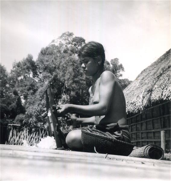| Young woman sitting on the platform of a house, pushing cotton through a gin mill (side view) |