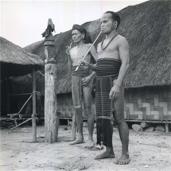 | Two men standing, a pipe in their mouths, before a house with walls woven with a staircase pattern, next to a sculpted and painted post |