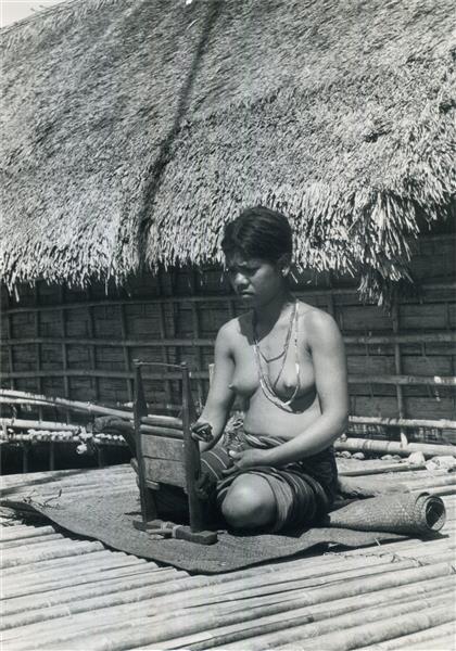 | Young woman squatting on a mat on the the platform of a house. A gin mill before her |