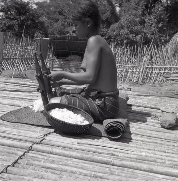 | Young woman sitting on the platform of a house, pushing cotton through a gin mill (alternate view) |