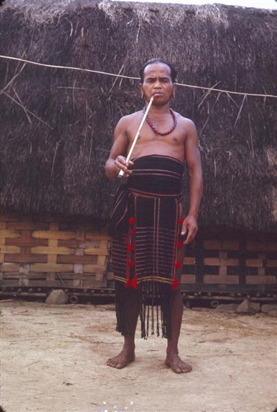 | Standing man with a thin beard, a pipe with a very long stem in his mouth, seen from front. He wears a long Sunday-best black loincloth with horizontal stripes and red pompons |
