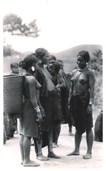 | Six women in two groups, the first consisting of two young women, one of whom is smiling with a slight tilt of her head and an older one carrying a crying baby |