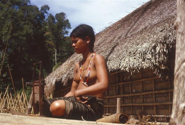 | Young woman sitting on the platform of a house on a half-unrolled mat, behind a gin mill. Her left hand is folded against her thigh |