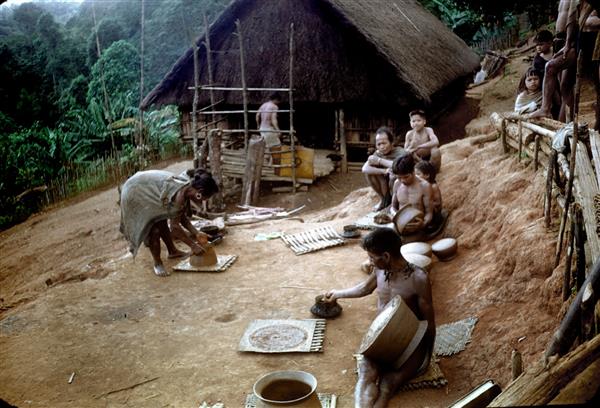 | Three potters working on an esplanade dug out in the slope, in front of a house. Men and children around them watching |