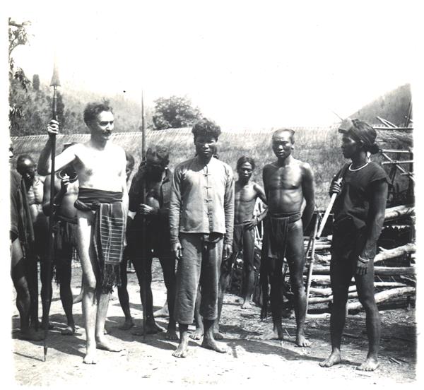 | Nine menstanding before a house, surrounding a tall white man dressed in local fashion, wearing only a , and holding a spear. Next to him, a young man dressed in Vietnamese style |